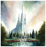 To the left, you see a temple that resembles those built by The Church of Jesus Christ of Latter- day Saints. However, this temple is not one that has ever been built by the Church—it is an imaginary temple. But what is so interesting about that? We can all close our eyes and imagine in our mind’s eye temples that do not currently exist. Talented artists could then put that to canvas and create a depiction. What is special is that this image